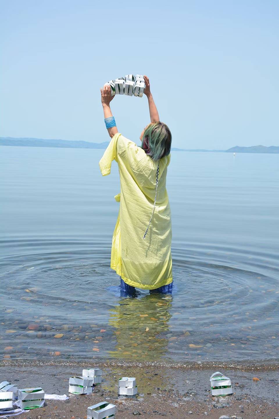 教室中央に山を作り、片隅には、糸を張った紙で池(水面)を作ります。